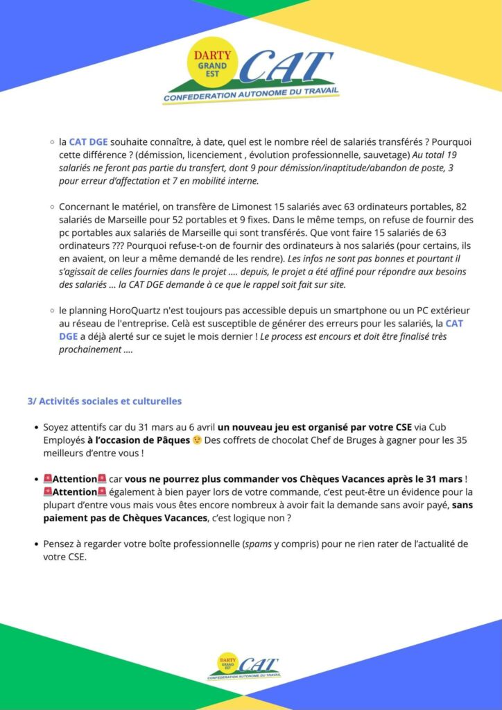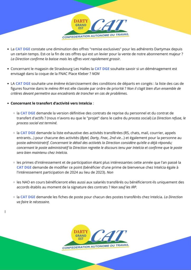 • la CAT DGE demande la liste exhaustive des activités transférées (RS, chats, mail, courrier, appels entrants…) pour chacune des activités (Bytel, Darty, Fnac, 2nd vie…) et également pour la personne au poste administratrif. Concernant le détail des activités la Direction considère qu’elle a déjà répondu; concernant le poste administratif la Direction regrette le discours tenu par Intelcia et confirme que le poste sera bien maintenu chez Intelcia.