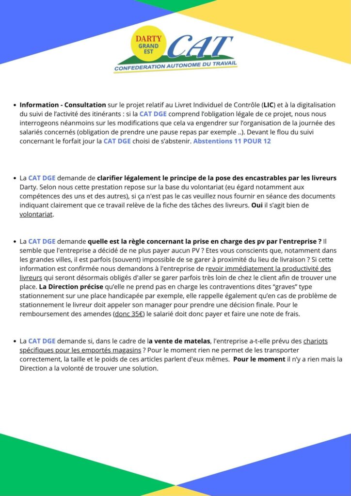 • Information – Consultation sur le projet relatif au Livret Individuel de Contrôle (LIC) et à la digitalisation du suivi de l’activité des itinérants: si la CAT DGE comprend l’obligation légale de ce projet, nous nous interrogeons néanmoins sur les modifications que cela va engendrer sur l’organisation de la journée des salariés concernés (obligation de prendre une pause repas par exemple ..). Devant le flou du suivi concernant le forfait jour la CAT DGE choisi de s’abstenir. Abstentions 11 POUR 12
