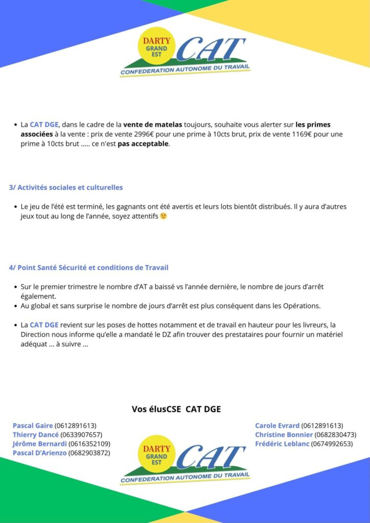 • La CAT DGE, dans le cadre de la vente de matelas toujours, souhaite vous alerter sur les primes associées à la vente : prix de vente 2996€ pour une prime à 10cts brut, prix de vente 1169€ pour une prime à 10cts brut ….. ce n’est pas acceptable.