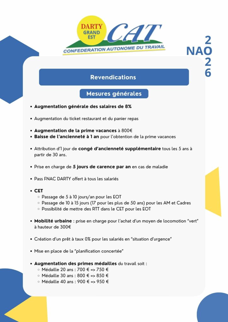 Notre plateforme de revendications porte une ambition simple : améliorer concrètement les conditions de travail, la reconnaissance et le pouvoir d’achat de l’ensemble des salariés. Elle s’appuie sur les réalités du terrain et sur les attentes exprimées par les équipes de tous les métiers.